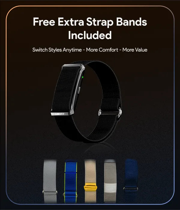 Two bands are included with the Qorfit Pulse: one black nylon and one black silicone. Colour bands are sold separately in packs of 5, available in two types — EVERYDAY CORE and VIBE CORE.