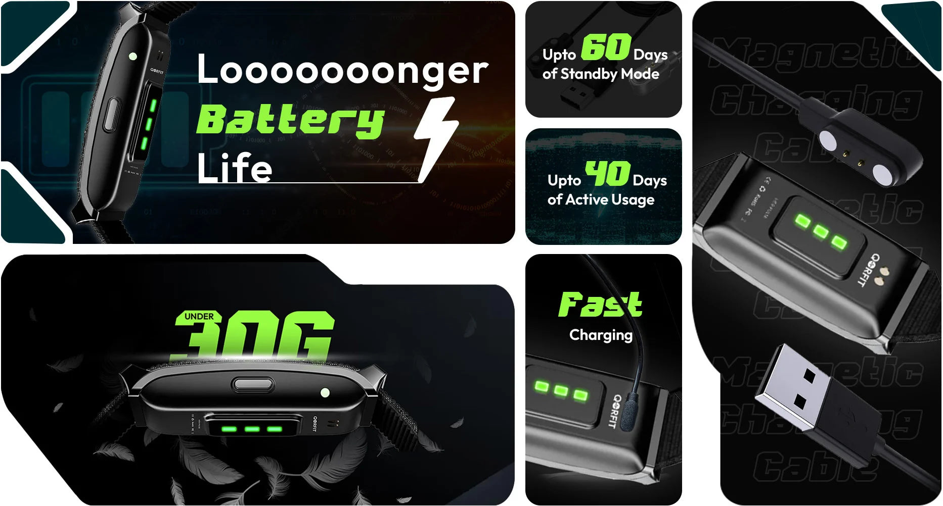 The battery lasts up to 45 days with optimal use; otherwise, it lasts about 30 days under regular usage. The device fully charges in approximately 2 hours.