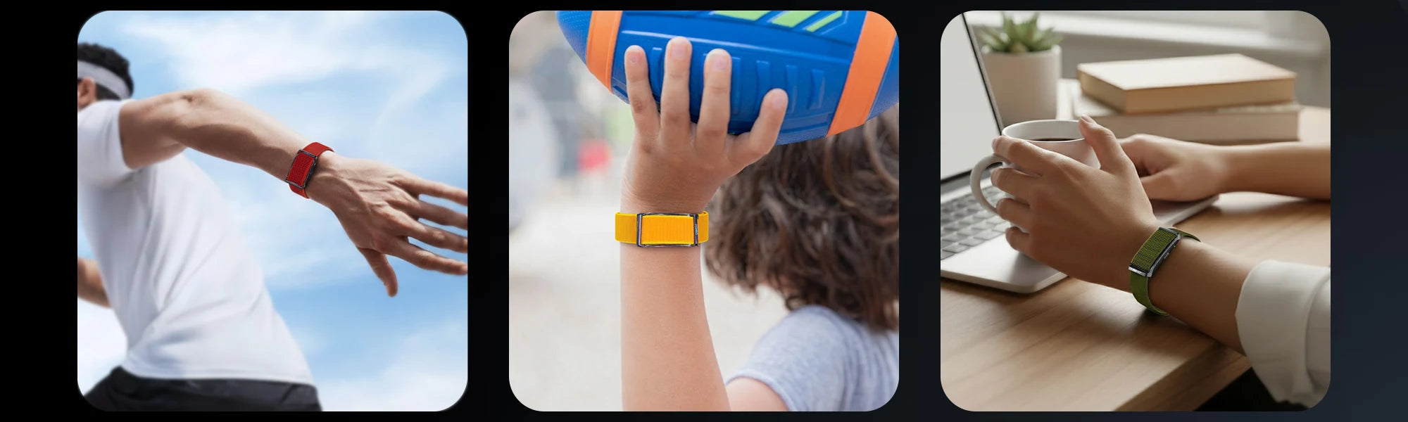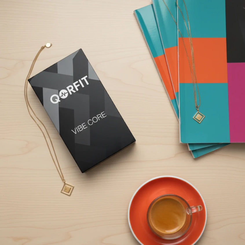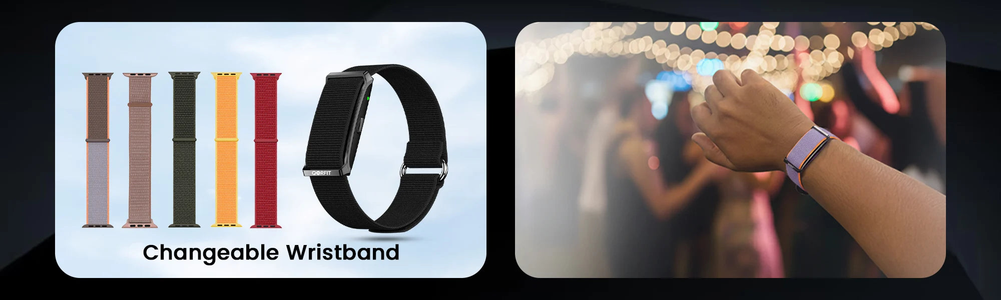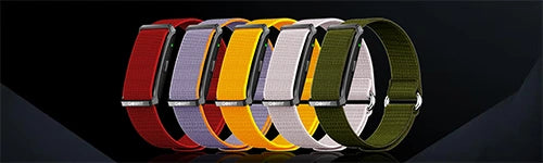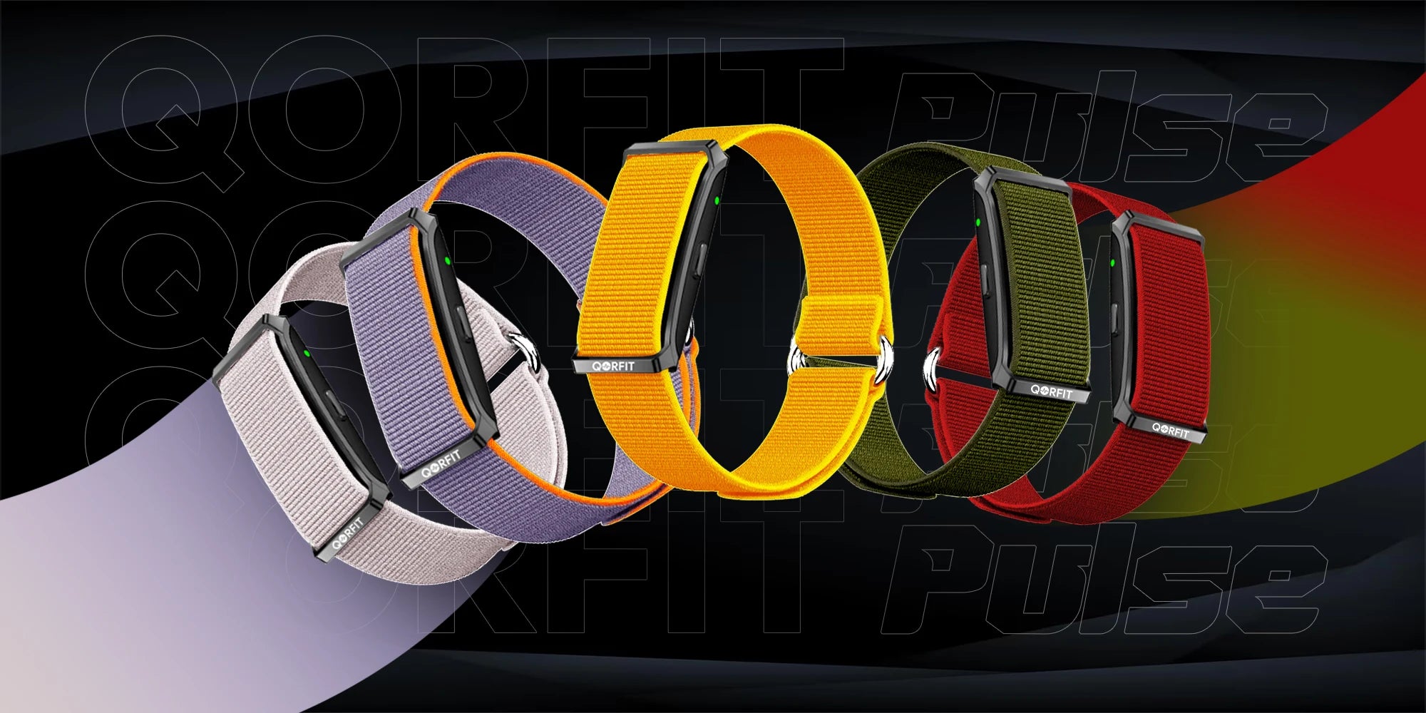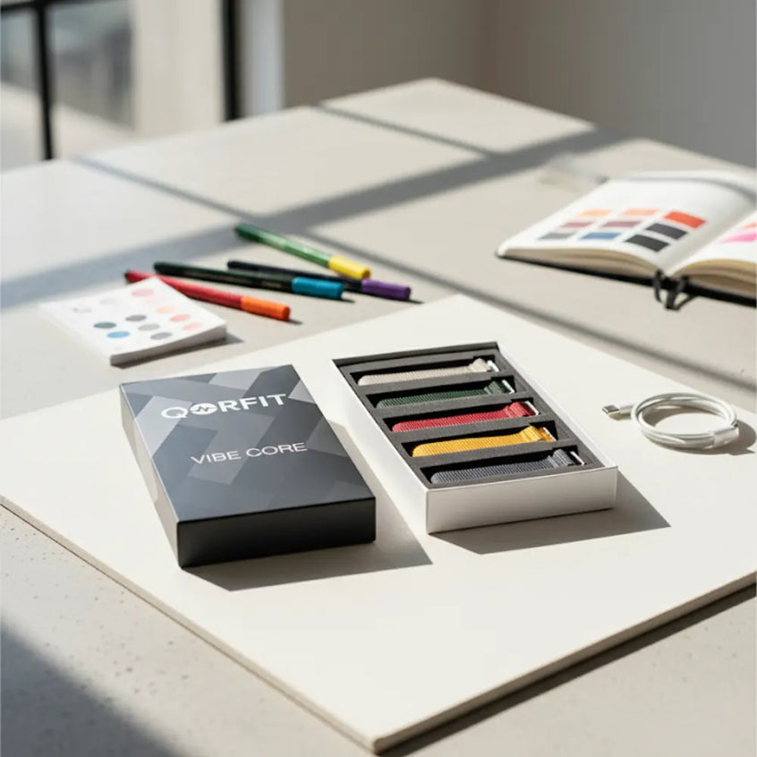 Two bands are included with the Qorfit Pulse: one black nylon and one black silicone. Colour bands are sold separately in packs of 5, available in two types — EVERYDAY CORE and VIBE CORE.